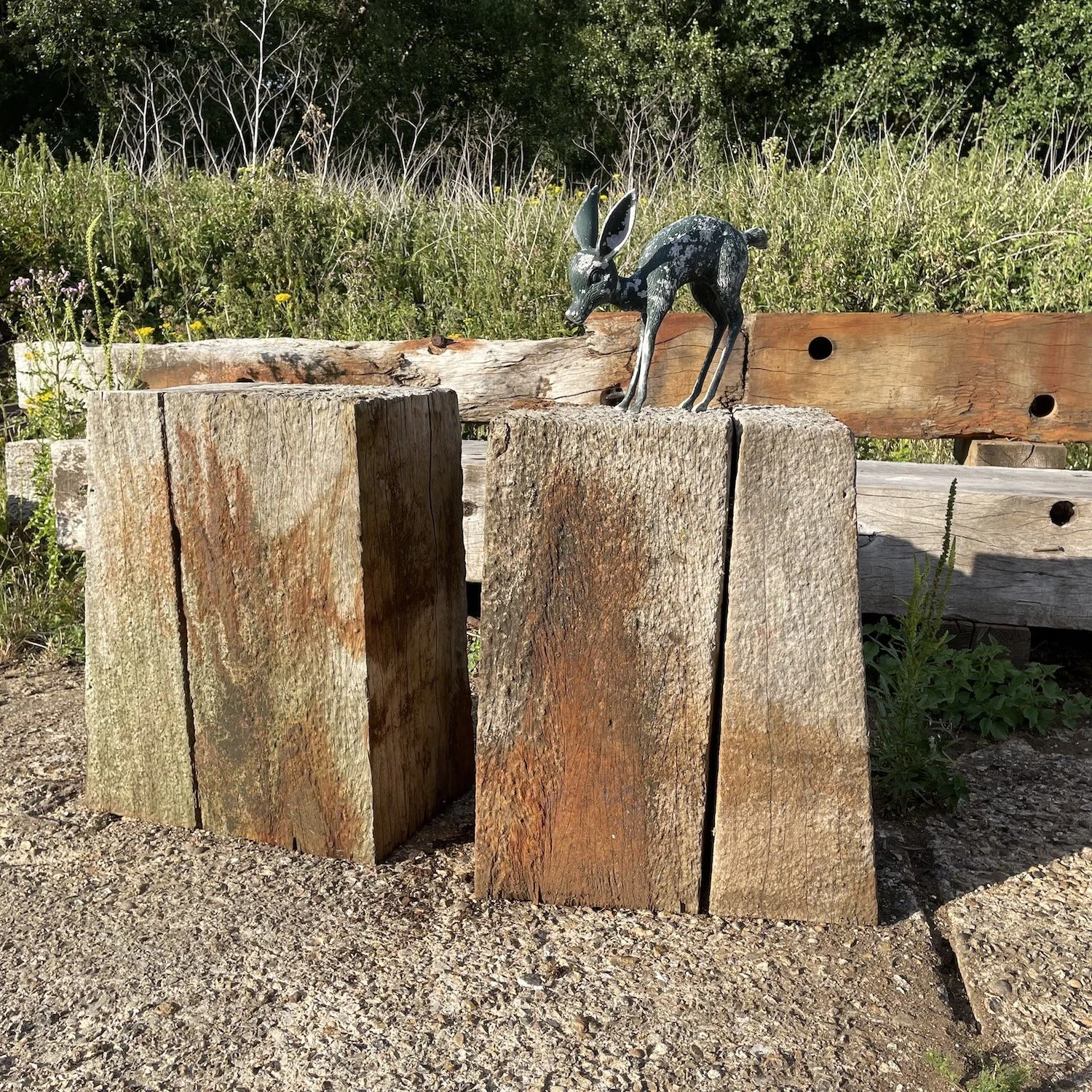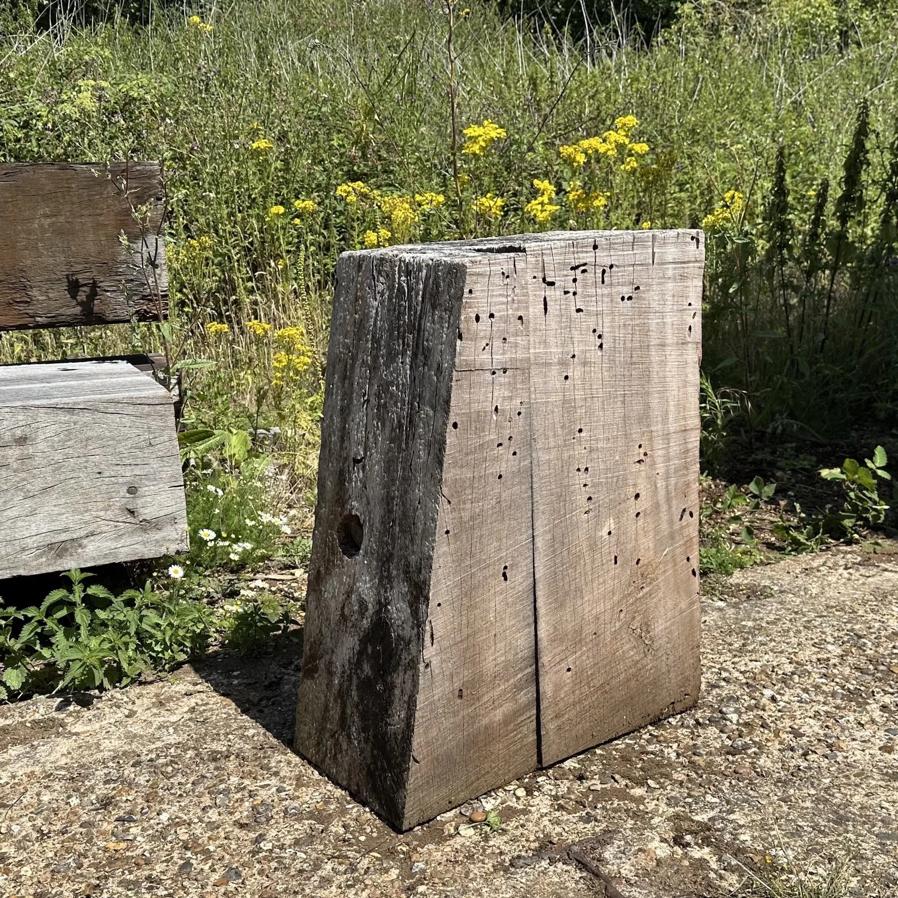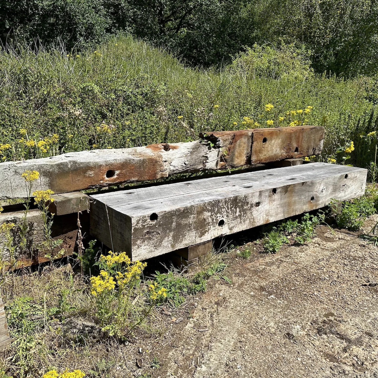 We have just unloaded an incredible set of reclaimed grain wharf timbers. Large scale Opepe timbers rescued from sea defence works on the River Yare in Great Yarmouth. A new sea wall 2 metre higher was required to keep the town safe from the predicted rising sea levels. The Opepe was imported from Ghana as logs to Tilbury, where it would have been sawn up and then carried by boat to Jewsons, Great Yarmouth, for the Port Authority to create wharves along the River Yare.